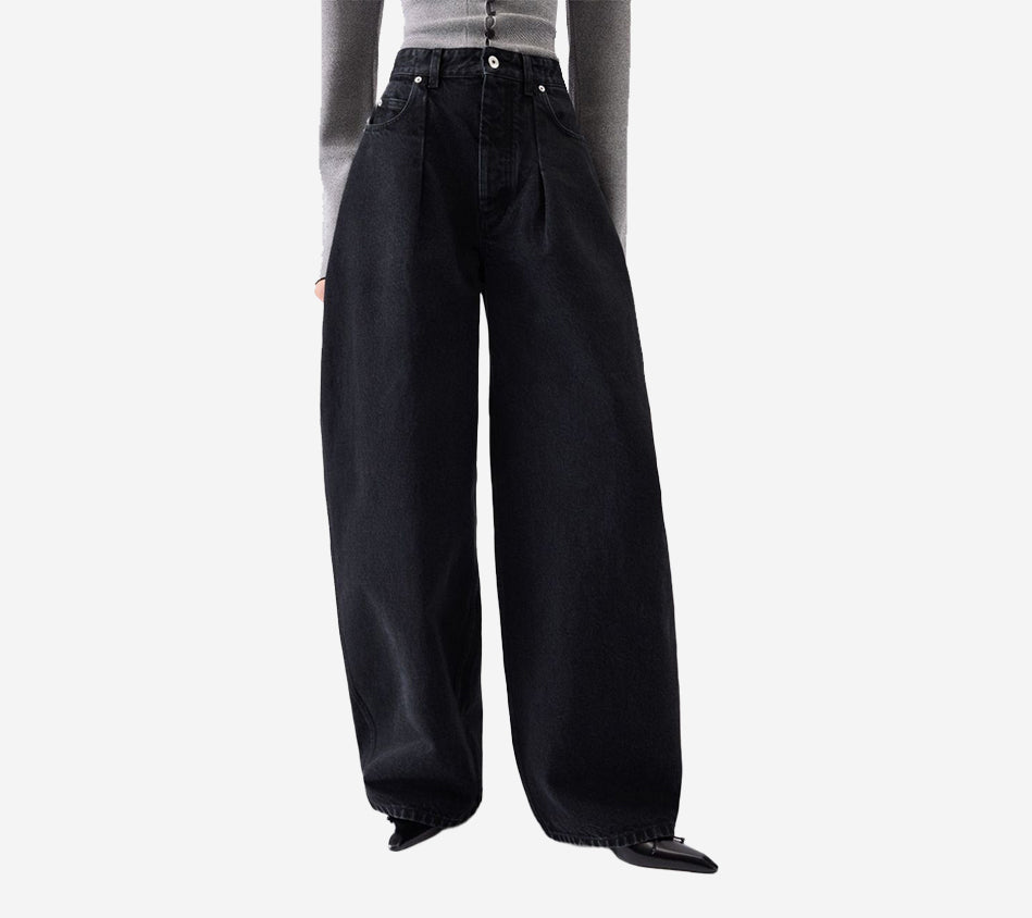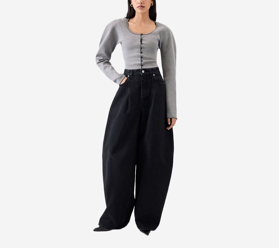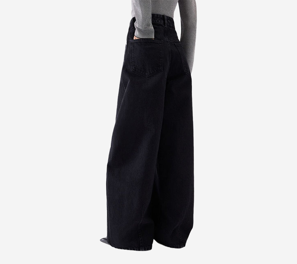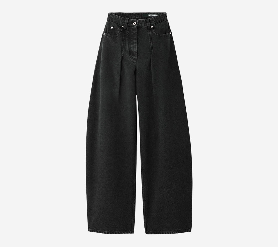 High-waisted curved jeans by Jacquemus. Crafted from washed black denim, featuring belt loops, a zip fly with an engraved metal button, and a five-pocket design including a ticket pocket. Detailed with an embroidered “J” on the hip, darts for shape, a long curved leg, and an embroidered patch, back yoke, and back patch pockets for a signature finish.
