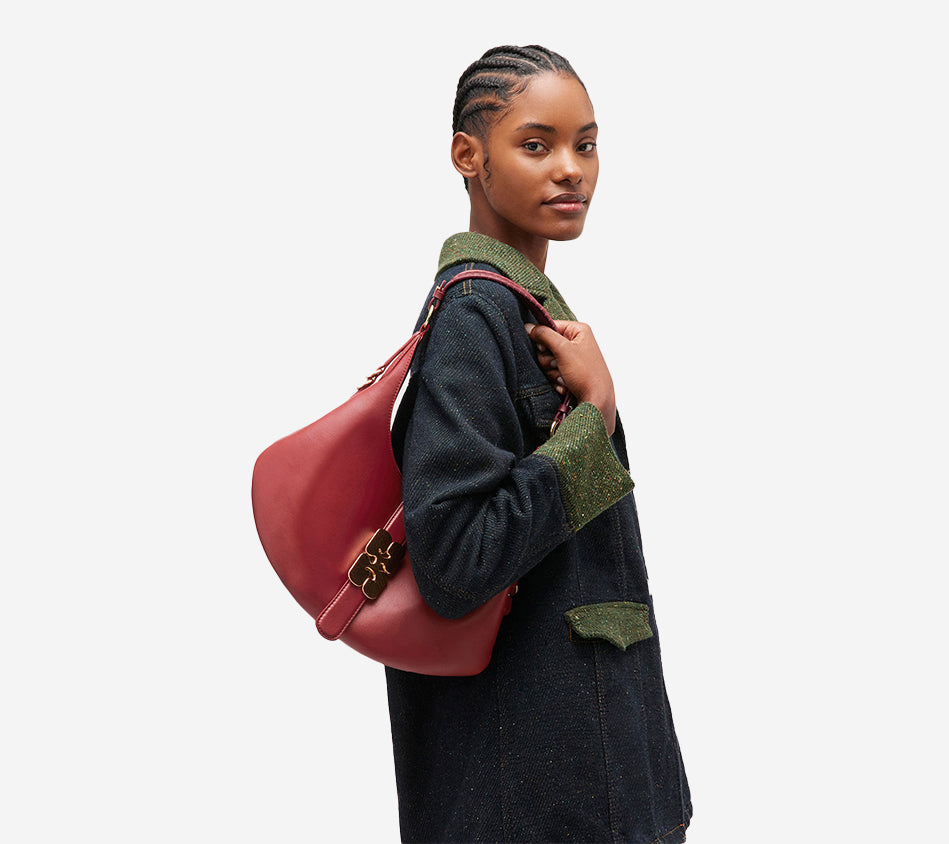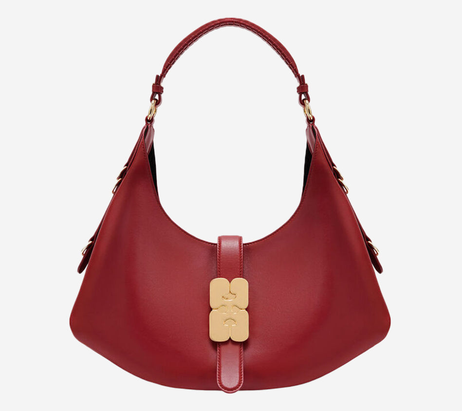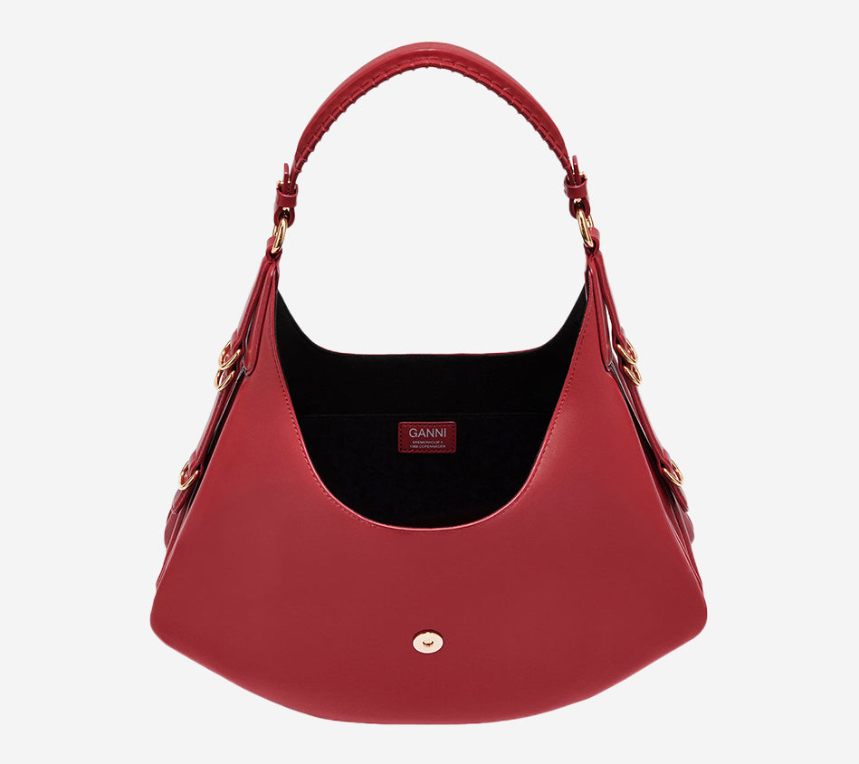 This bag features a soufflet-style silhouette, a shoulder strap and D-ring detailing at the side. The bag has a closure tab with the signature GANNI Butterfly clasp in gold-tone, 1 main compartment and an inside open pocket.