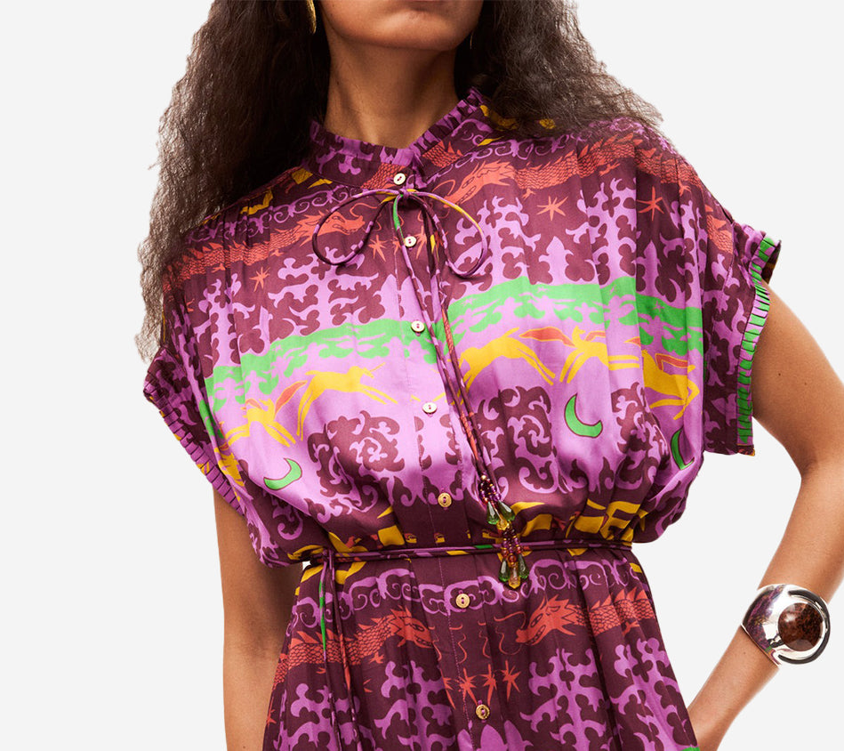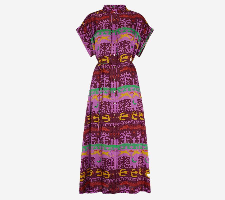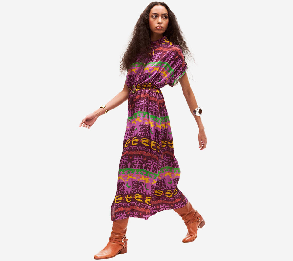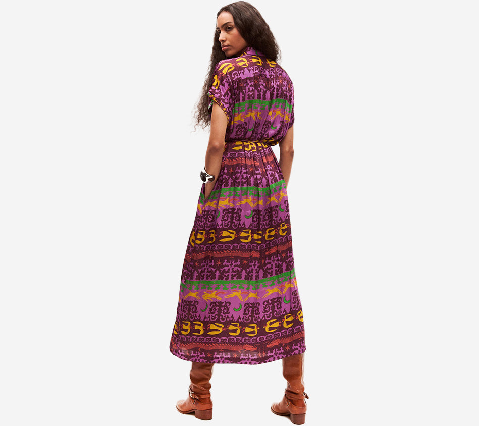 - Midi dress in shades of purple, yellow, green, and pink