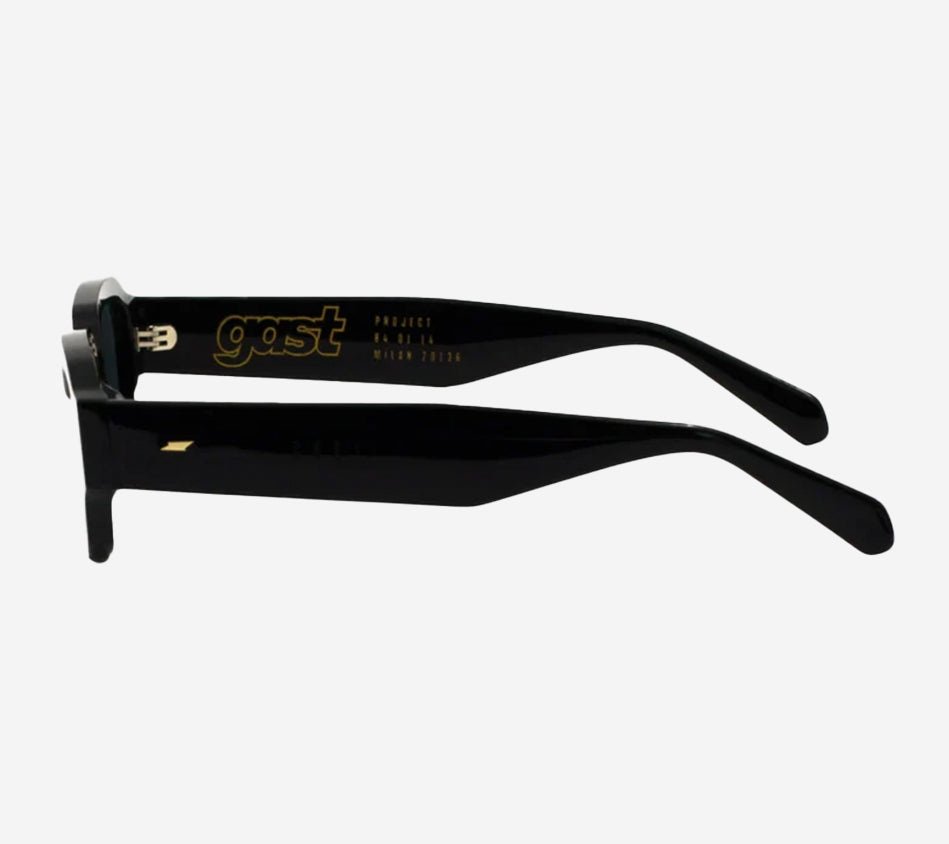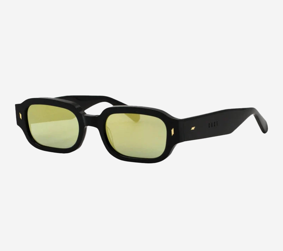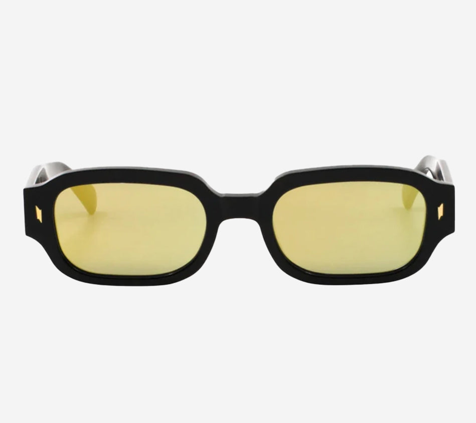 Handmade sunglasses with black acetate frame and mirrored gold semi-flat nylon lenses with anti-reflective inside coating – 100% UVA / UVB protection - Cat.3. Five barrels metal hinges. Premium hard case and microfiber cleaning cloth.