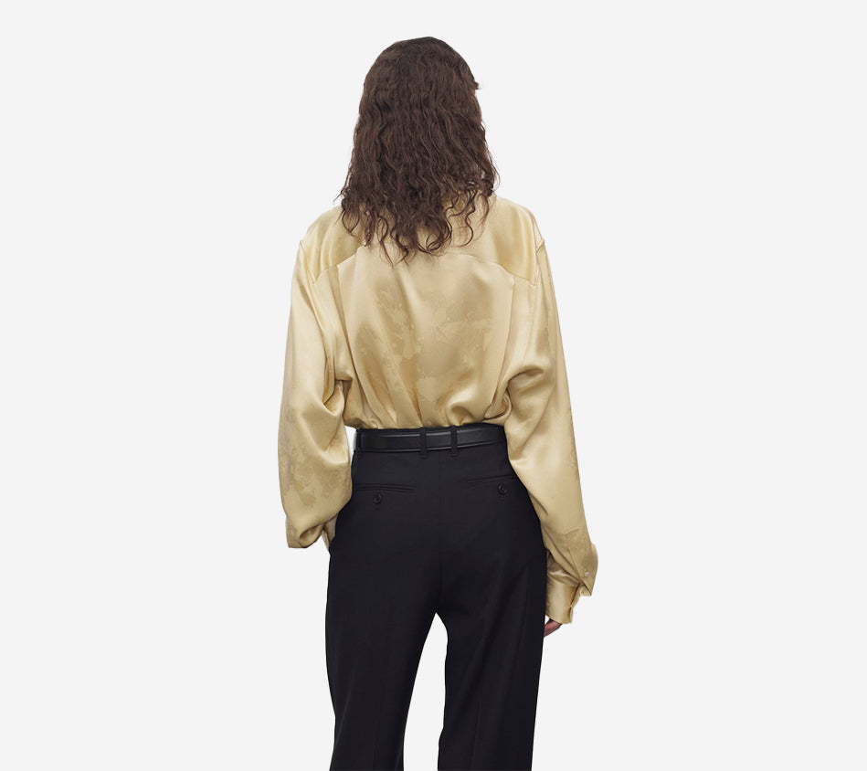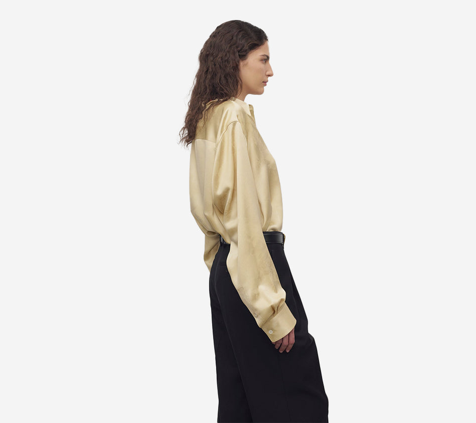 Classic button-up shirt in textured silk crepe with relaxed fit, back yoke with side pleats, and exposed front placket with mother-of-pearl buttons.