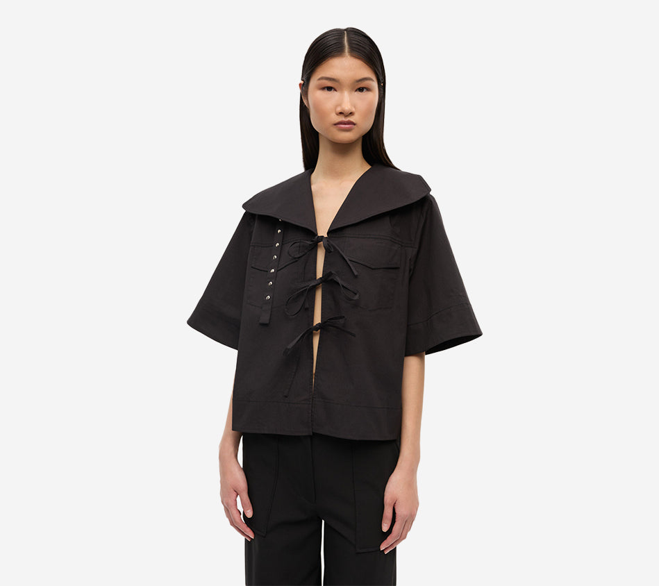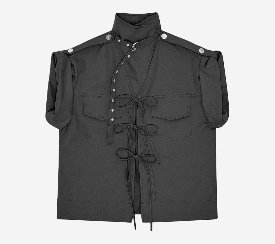 This blouse features a large collar, an adjustable high neck design and adjustable sleeves. The blouse has chest pockets and three tie bands at the front.